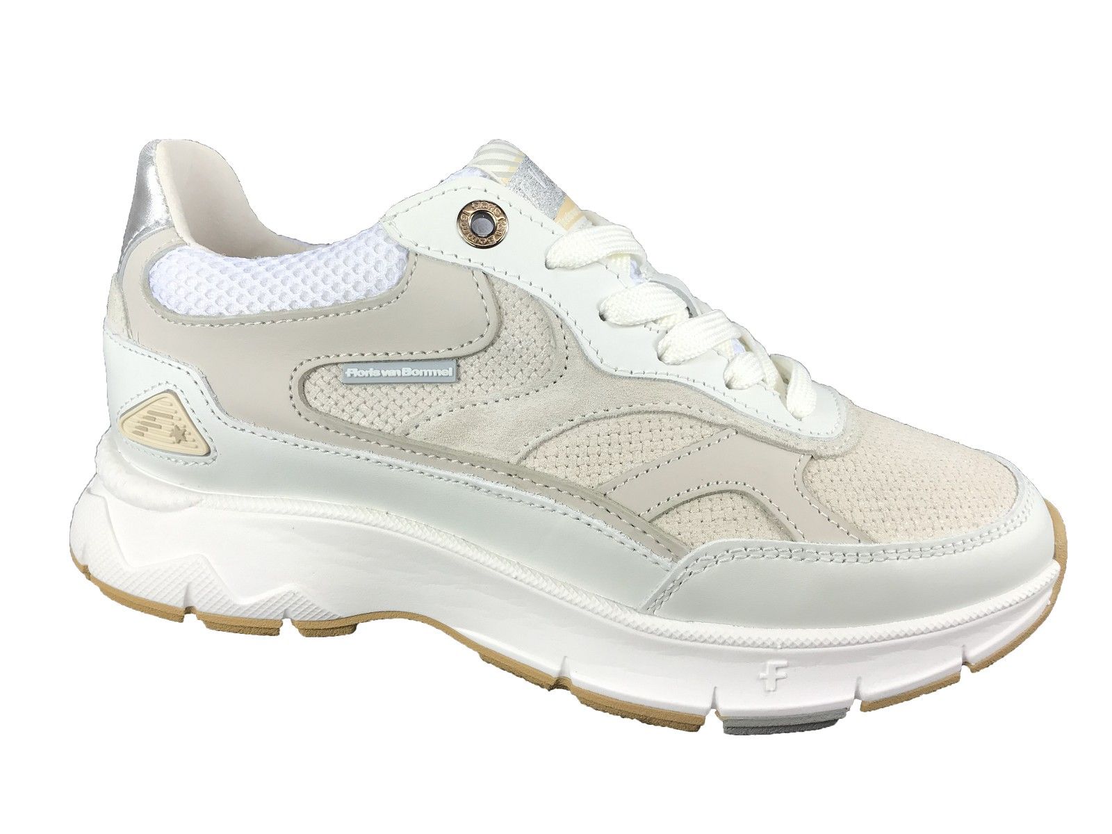 Op de tong, zijkant en hiel zijn subtiele Floris van Bommel-logo’s verwerkt, en het zigzag-sierstiksel aan de hiel geeft de sneaker extra karakter.