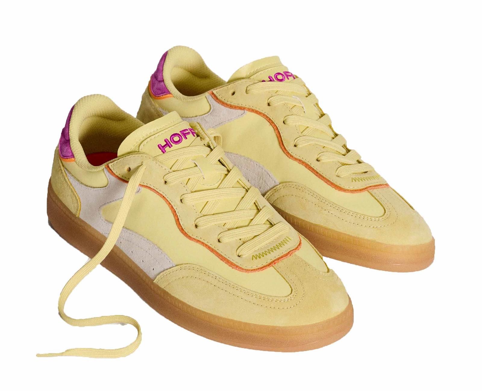 HOFF Park Mimosa sneaker in geel met suède en nylon. Comfortabele unisex sneaker met memory foam zool en vintage look. Ontdek bij Bonne Shoe.