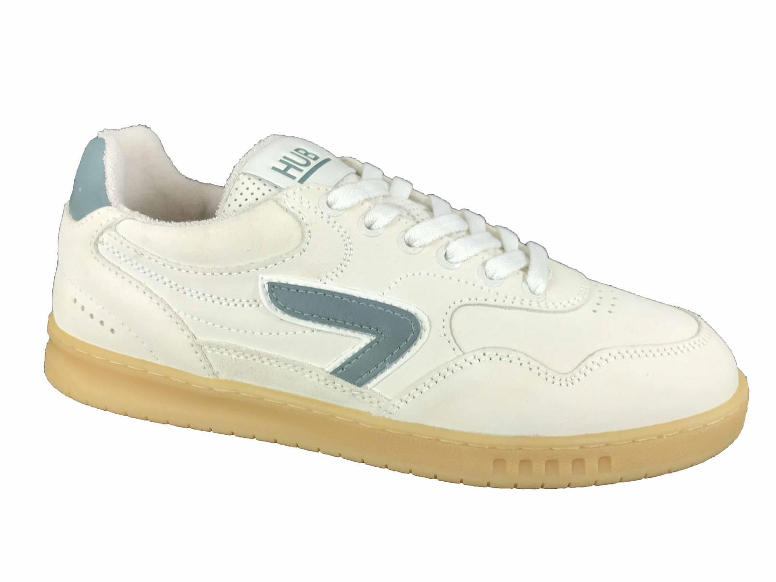 HUB Vancouver unisex sneaker in off-white en donkergroen met retro look en dunne zool. Comfortabel, duurzaam en met uitneembare binnenzool.