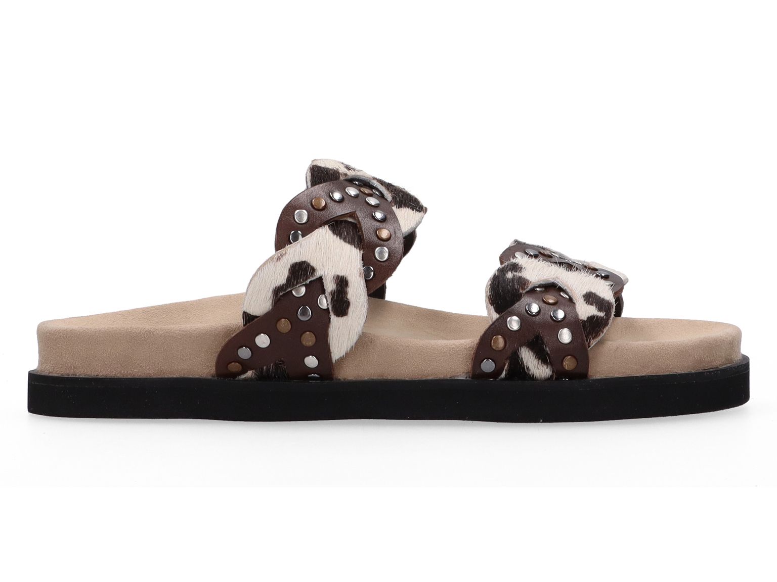 Het hair-on leer met koeienprint maakt van deze slipper een echte blikvanger die elke outfit nét dat tikkeltje extra geeft.